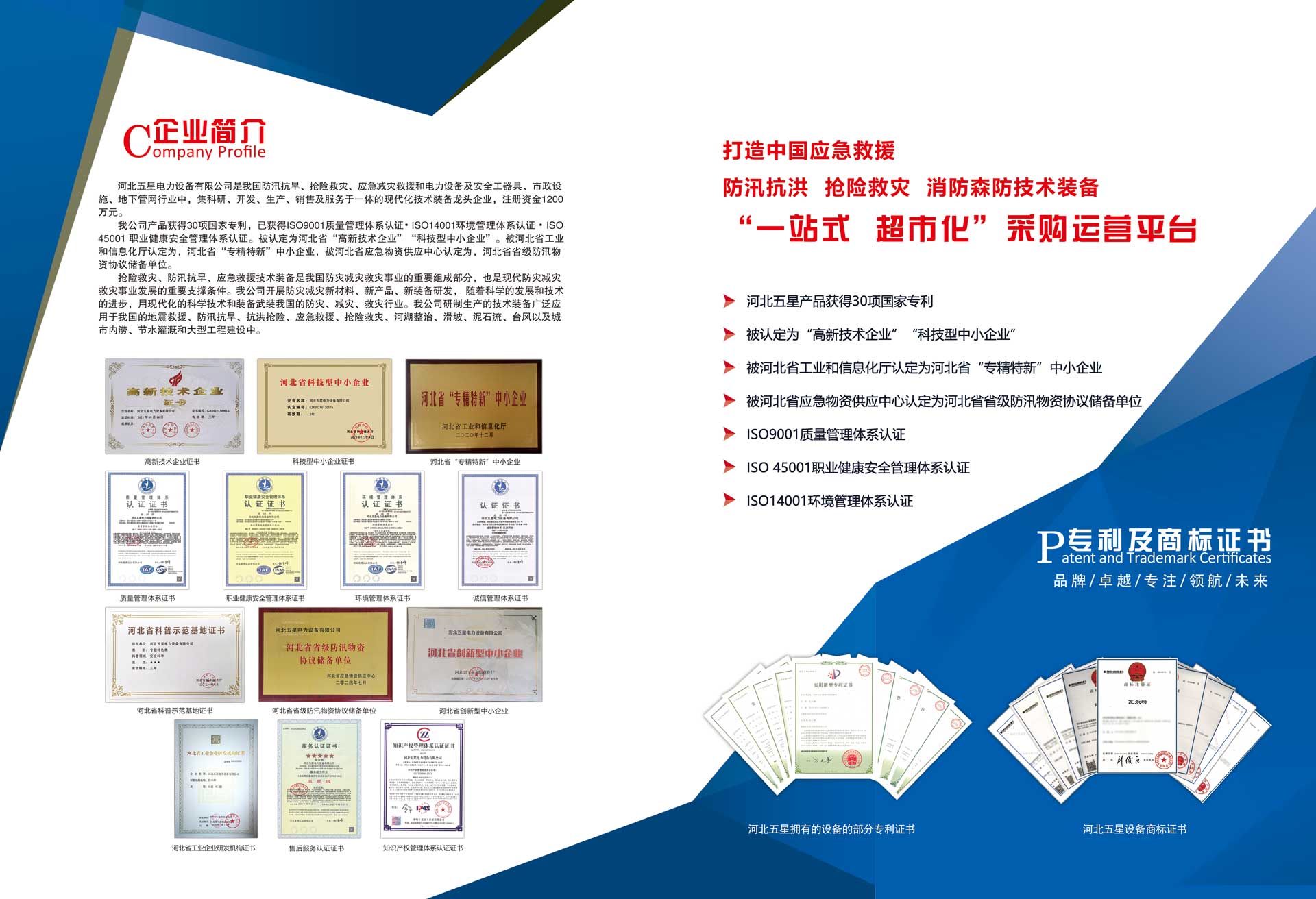 河北五星電力設備有限公司是我國防汛抗旱、搶險救災、應急減災救援和電力設備及安全工器具、市政設施、地下管網行業中,集科研、開發、生產、銷售及服務于一體的現代化技術裝備高新技術企業,注冊資金1200萬元?! ∥夜井a品已獲得ISO9001質量管理體系...